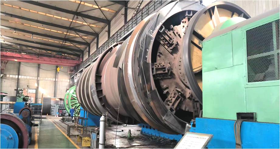 公司加工φ4.4×15m青灰爐筒節(jié)正在重型成套廠大頭車上進行精車工序。
